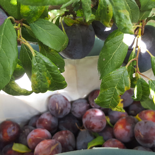 Deep-coloured, richly flavoured plums from Perriam Orchard — including Omega, Fortune, Luisa and more. Sweet, juicy and aromatic, hand-picked for freshness and perfect for snacking or baking.